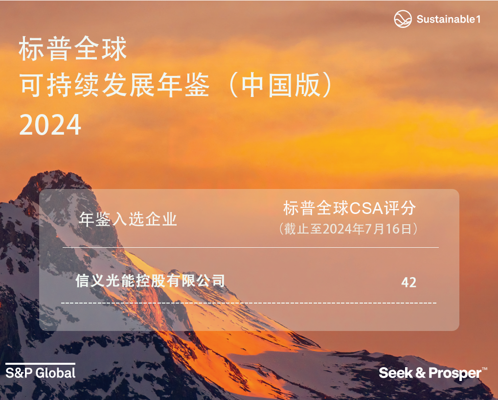 (二零二四年七月十七日,香港讯)—— 全球最大太阳能玻璃制造商信义光能控股有限公司(「信义光能」或「集团」)(股份代号:00968)欣然宣布,集团入选标普全球《可持续发展年鉴(中国版)2024》(「年鉴」)。自标普全球于2023年首度发布《可持续发展年鉴(中国版)》以来,信义光能已连续两年得到此项殊荣,彰显了集团在推进环境、社会及管治(「ESG」)方面的成果获国际业界高度认可。信义光能早前亦在美国权威财经杂志《机构投资者》(Institutional Investor)举办的「2024年亚洲最佳管理团队排行榜」(2024 Asia (ex-Japan) Executive Team Rankings)中再次表现卓越,连续五年获评为「最受尊崇企业」,并在「最佳公司董事会」、「最佳ESG」、「最佳首席执行官」、「最佳首席财务官」、「最佳投资者关系专员」等多个分类评选中位列工业(包括基建行业)前三。