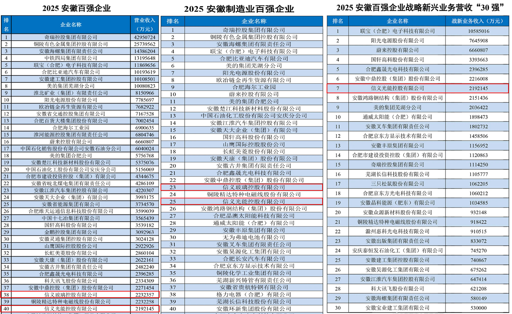 信義系两家上市公司信義玻璃控股有限公司和信義光能控股有限公司凭借稳健的经营发展,在多项榜单中斩获佳绩。其中信義光能位列安徽百强企业第40位、安徽制造业百强企业第25位、安徽百强企业战略新兴业务营收“30强”第7位,彰显了企业在新能源领域的核心竞争力。